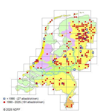 Het aantal atlasblokken (5x5 km) waarin de soort is gemeld binnen een periode van vijf jaar (vanaf 1980) of twintig jaar. Niet gecorrigeerd voor waarnemersinspanning en het aantal doorgegeven waarnemingen kan sterk variëren per periode, dus een trend in verspreiding kan hier niet direct uit worden afgelezen. Het opgegeven jaartal is het eerste jaar van de periode. Bron: gevalideerde waarnemingen uit de NDFF.