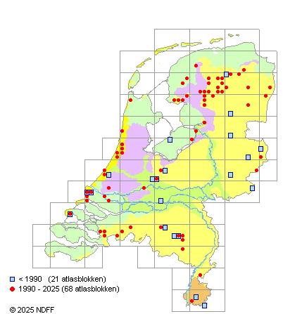 Het aantal atlasblokken (5x5 km) waarin de soort is gemeld binnen een periode van vijf jaar (vanaf 1980) of twintig jaar. Niet gecorrigeerd voor waarnemersinspanning en het aantal doorgegeven waarnemingen kan sterk variëren per periode, dus een trend in verspreiding kan hier niet direct uit worden afgelezen. Het opgegeven jaartal is het eerste jaar van de periode. Bron: gevalideerde waarnemingen uit de NDFF.