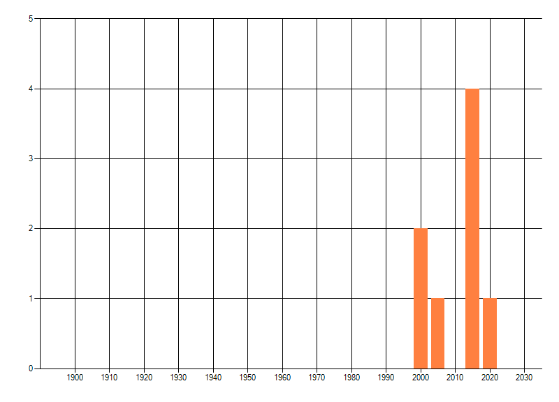 Het aantal atlasblokken (5x5 km) waarin de soort is gemeld binnen een periode van vijf jaar (vanaf 1980) of twintig jaar. Niet gecorrigeerd voor waarnemersinspanning en het aantal doorgegeven waarnemingen kan sterk variëren per periode, dus een trend in verspreiding kan hier niet direct uit worden afgelezen. Het opgegeven jaartal is het eerste jaar van de periode. Bron: gevalideerde waarnemingen uit de NDFF.