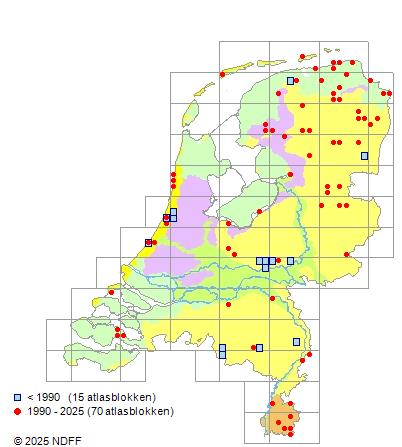 Het aantal atlasblokken (5x5 km) waarin de soort is gemeld binnen een periode van vijf jaar (vanaf 1980) of twintig jaar. Niet gecorrigeerd voor waarnemersinspanning en het aantal doorgegeven waarnemingen kan sterk variëren per periode, dus een trend in verspreiding kan hier niet direct uit worden afgelezen. Het opgegeven jaartal is het eerste jaar van de periode. Bron: gevalideerde waarnemingen uit de NDFF.