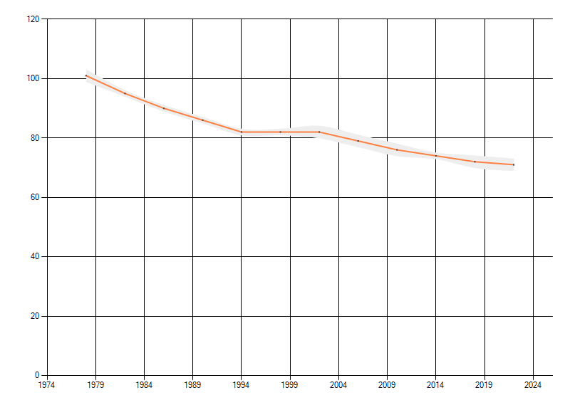 Gemiddelde trend van het aantal kilometerhokken waarin de soort voorkomt, weergegeven als indexcijfer (1975-1978 = 100).