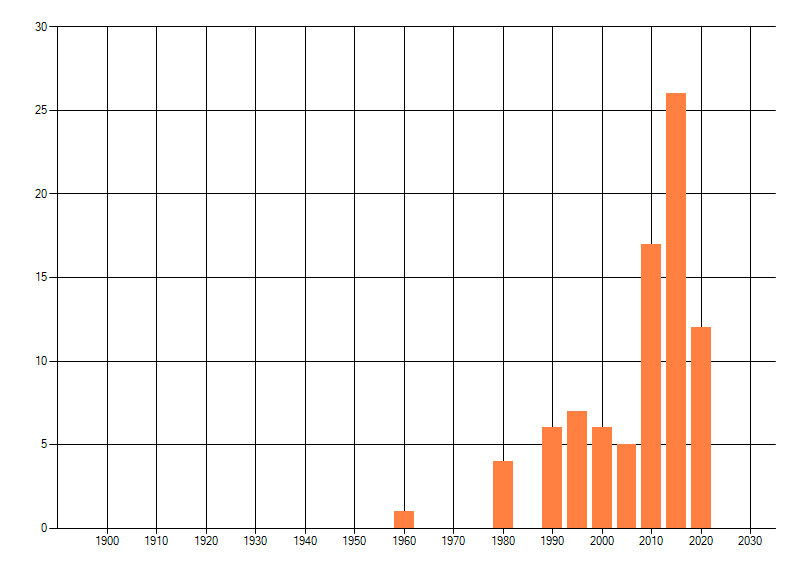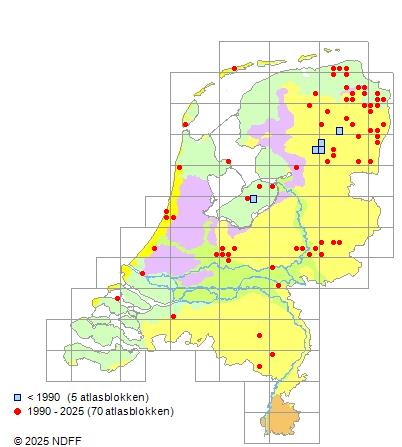Het aantal atlasblokken (5x5 km) waarin de soort is gemeld binnen een periode van vijf jaar (vanaf 1980) of twintig jaar. Niet gecorrigeerd voor waarnemersinspanning en het aantal doorgegeven waarnemingen kan sterk variëren per periode, dus een trend in verspreiding kan hier niet direct uit worden afgelezen. Het opgegeven jaartal is het eerste jaar van de periode. Bron: gevalideerde waarnemingen uit de NDFF.