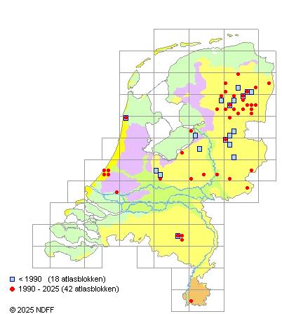 Het aantal atlasblokken (5x5 km) waarin de soort is gemeld binnen een periode van vijf jaar (vanaf 1980) of twintig jaar. Niet gecorrigeerd voor waarnemersinspanning en het aantal doorgegeven waarnemingen kan sterk variëren per periode, dus een trend in verspreiding kan hier niet direct uit worden afgelezen. Het opgegeven jaartal is het eerste jaar van de periode. Bron: gevalideerde waarnemingen uit de NDFF.