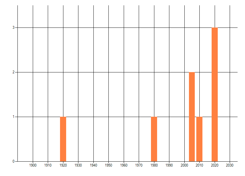 Het aantal atlasblokken (5x5 km) waarin de soort is gemeld binnen een periode van vijf jaar (vanaf 1980) of twintig jaar. Niet gecorrigeerd voor waarnemersinspanning en het aantal doorgegeven waarnemingen kan sterk variëren per periode, dus een trend in verspreiding kan hier niet direct uit worden afgelezen. Het opgegeven jaartal is het eerste jaar van de periode. Bron: gevalideerde waarnemingen uit de NDFF.