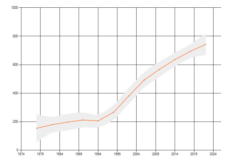 In de grafiek correspondeert ieder punt met het laatste jaar van zo'n periode.