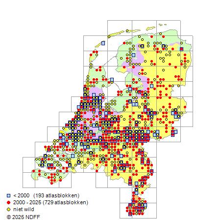 CC BY-NC-SA 3.0 NLVerspreidingNederlandZeldzaam. Voornamelijk in het rivierengebied, in de Hollandse en Zeeuwse duinen en in stedelijke omgeving.