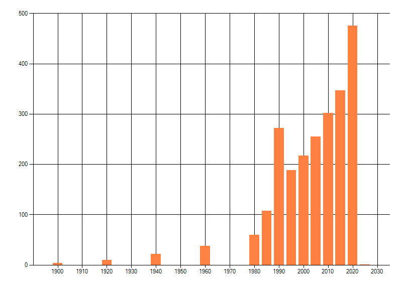 Het aantal atlasblokken (5x5 km) waarin de soort is gemeld binnen een periode van vijf jaar (vanaf 1980) of twintig jaar. Niet gecorrigeerd voor waarnemersinspanning en het aantal doorgegeven waarnemingen kan sterk variëren per periode, dus een trend in verspreiding kan hier niet direct uit worden afgelezen. Het opgegeven jaartal is het eerste jaar van de periode. Bron: gevalideerde waarnemingen uit de NDFF.