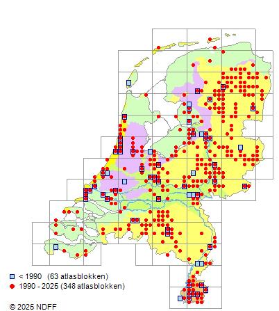 Het aantal atlasblokken (5x5 km) waarin de soort is gemeld binnen een periode van vijf jaar (vanaf 1980) of twintig jaar. Niet gecorrigeerd voor waarnemersinspanning en het aantal doorgegeven waarnemingen kan sterk variëren per periode, dus een trend in verspreiding kan hier niet direct uit worden afgelezen. Het opgegeven jaartal is het eerste jaar van de periode. Bron: gevalideerde waarnemingen uit de NDFF.