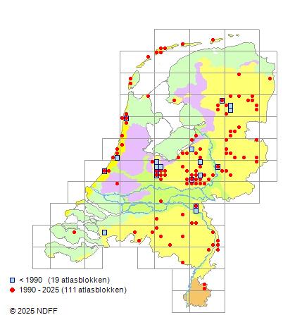 Het aantal atlasblokken (5x5 km) waarin de soort is gemeld binnen een periode van vijf jaar (vanaf 1980) of twintig jaar. Niet gecorrigeerd voor waarnemersinspanning en het aantal doorgegeven waarnemingen kan sterk variëren per periode, dus een trend in verspreiding kan hier niet direct uit worden afgelezen. Het opgegeven jaartal is het eerste jaar van de periode. Bron: gevalideerde waarnemingen uit de NDFF.