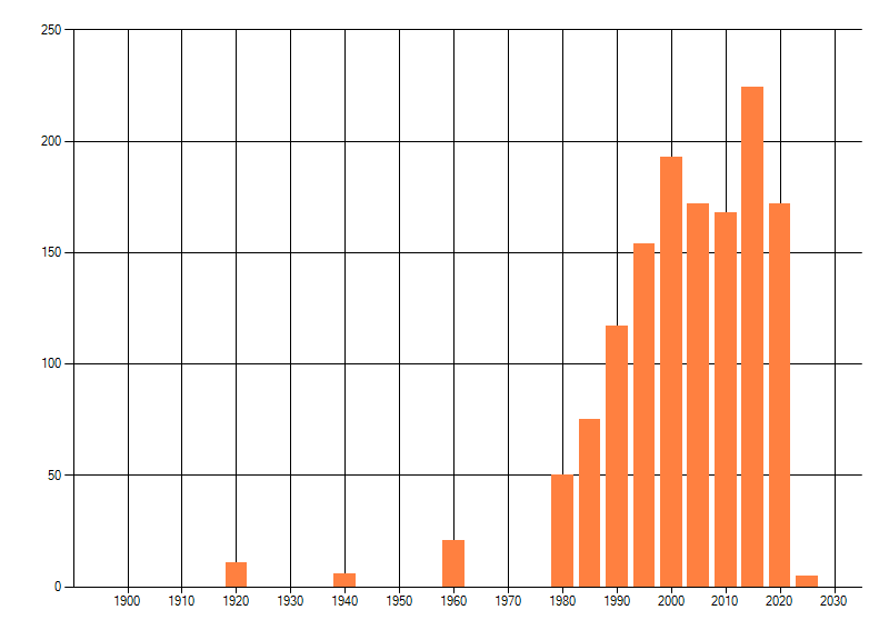 Het aantal atlasblokken (5x5 km) waarin de soort is gemeld binnen een periode van vijf jaar (vanaf 1980) of twintig jaar. Niet gecorrigeerd voor waarnemersinspanning en het aantal doorgegeven waarnemingen kan sterk variëren per periode, dus een trend in verspreiding kan hier niet direct uit worden afgelezen. Het opgegeven jaartal is het eerste jaar van de periode. Bron: gevalideerde waarnemingen uit de NDFF.