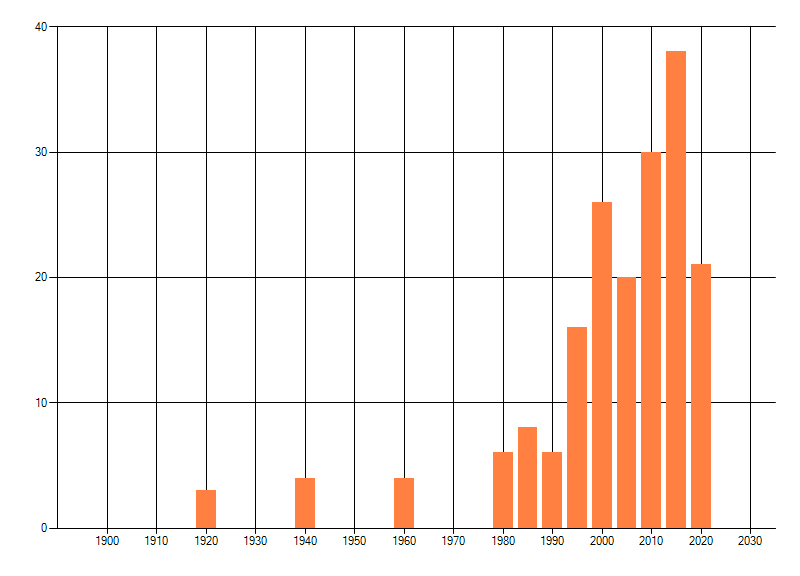 Het aantal atlasblokken (5x5 km) waarin de soort is gemeld binnen een periode van vijf jaar (vanaf 1980) of twintig jaar. Niet gecorrigeerd voor waarnemersinspanning en het aantal doorgegeven waarnemingen kan sterk variëren per periode, dus een trend in verspreiding kan hier niet direct uit worden afgelezen. Het opgegeven jaartal is het eerste jaar van de periode. Bron: gevalideerde waarnemingen uit de NDFF.
