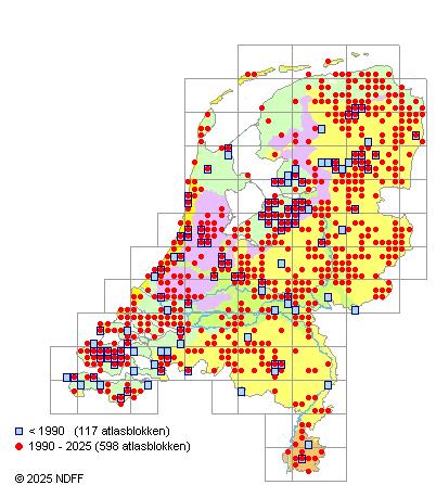 Het aantal atlasblokken (5x5 km) waarin de soort is gemeld binnen een periode van vijf jaar (vanaf 1980) of twintig jaar. Niet gecorrigeerd voor waarnemersinspanning en het aantal doorgegeven waarnemingen kan sterk variëren per periode, dus een trend in verspreiding kan hier niet direct uit worden afgelezen. Het opgegeven jaartal is het eerste jaar van de periode. Bron: gevalideerde waarnemingen uit de NDFF.