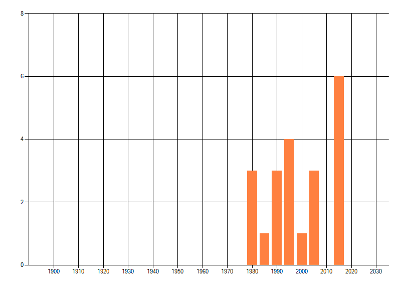 Het aantal atlasblokken (5x5 km) waarin de soort is gemeld binnen een periode van vijf jaar (vanaf 1980) of twintig jaar. Niet gecorrigeerd voor waarnemersinspanning en het aantal doorgegeven waarnemingen kan sterk variëren per periode, dus een trend in verspreiding kan hier niet direct uit worden afgelezen. Het opgegeven jaartal is het eerste jaar van de periode. Bron: gevalideerde waarnemingen uit de NDFF.