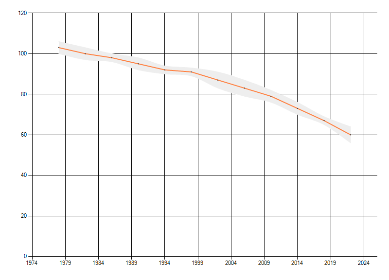 Gemiddelde trend van het aantal kilometerhokken waarin de soort voorkomt, weergegeven als indexcijfer (1975-1978 = 100).