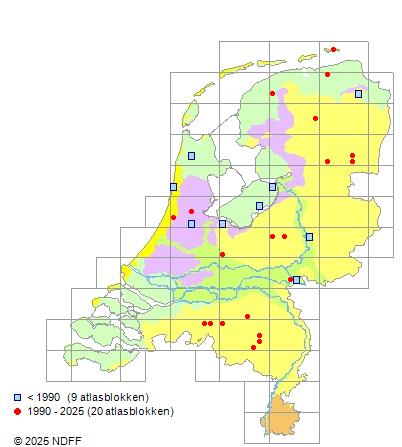 Het aantal atlasblokken (5x5 km) waarin de soort is gemeld binnen een periode van vijf jaar (vanaf 1980) of twintig jaar. Niet gecorrigeerd voor waarnemersinspanning en het aantal doorgegeven waarnemingen kan sterk variëren per periode, dus een trend in verspreiding kan hier niet direct uit worden afgelezen. Het opgegeven jaartal is het eerste jaar van de periode. Bron: gevalideerde waarnemingen uit de NDFF.