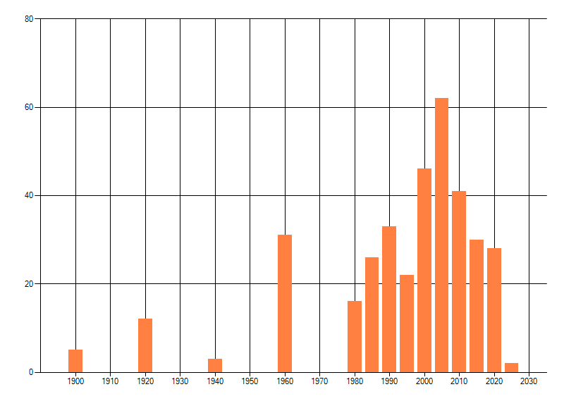 Het aantal atlasblokken (5x5 km) waarin de soort is gemeld binnen een periode van vijf jaar (vanaf 1980) of twintig jaar. Niet gecorrigeerd voor waarnemersinspanning en het aantal doorgegeven waarnemingen kan sterk variëren per periode, dus een trend in verspreiding kan hier niet direct uit worden afgelezen. Het opgegeven jaartal is het eerste jaar van de periode. Bron: gevalideerde waarnemingen uit de NDFF.
