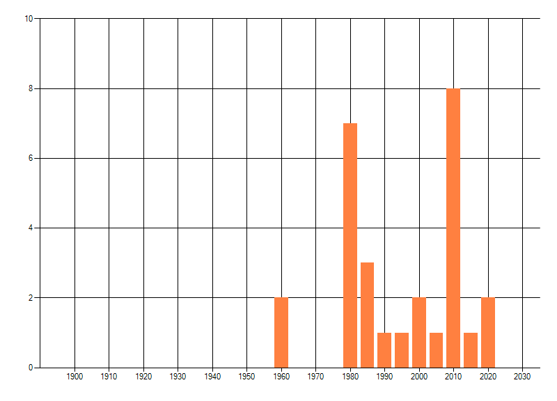 Het aantal atlasblokken (5x5 km) waarin de soort is gemeld binnen een periode van vijf jaar (vanaf 1980) of twintig jaar. Niet gecorrigeerd voor waarnemersinspanning en het aantal doorgegeven waarnemingen kan sterk variëren per periode, dus een trend in verspreiding kan hier niet direct uit worden afgelezen. Het opgegeven jaartal is het eerste jaar van de periode. Bron: gevalideerde waarnemingen uit de NDFF.