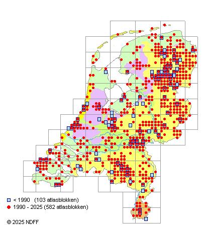 Het aantal atlasblokken (5x5 km) waarin de soort is gemeld binnen een periode van vijf jaar (vanaf 1980) of twintig jaar. Niet gecorrigeerd voor waarnemersinspanning en het aantal doorgegeven waarnemingen kan sterk variëren per periode, dus een trend in verspreiding kan hier niet direct uit worden afgelezen. Het opgegeven jaartal is het eerste jaar van de periode. Bron: gevalideerde waarnemingen uit de NDFF.