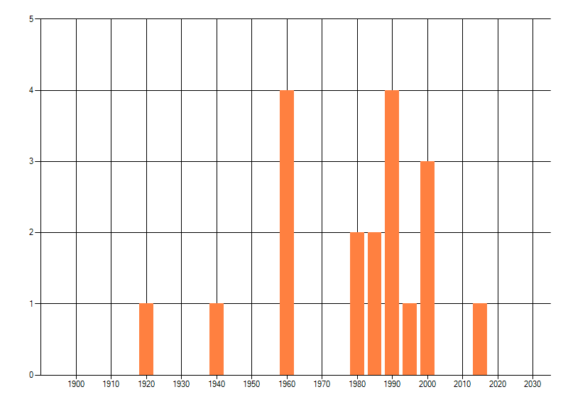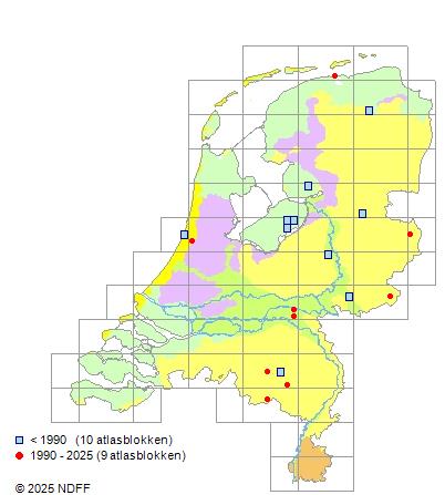 Het aantal atlasblokken (5x5 km) waarin de soort is gemeld binnen een periode van vijf jaar (vanaf 1980) of twintig jaar. Niet gecorrigeerd voor waarnemersinspanning en het aantal doorgegeven waarnemingen kan sterk variëren per periode, dus een trend in verspreiding kan hier niet direct uit worden afgelezen. Het opgegeven jaartal is het eerste jaar van de periode. Bron: gevalideerde waarnemingen uit de NDFF.