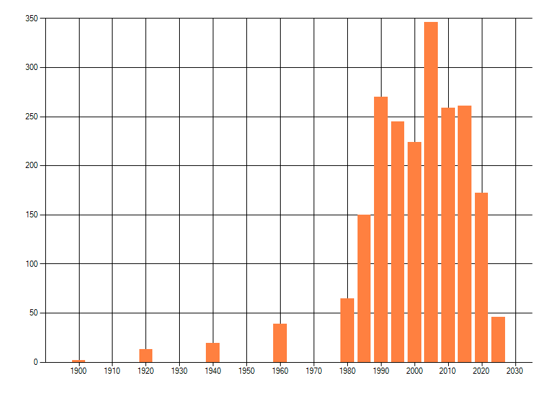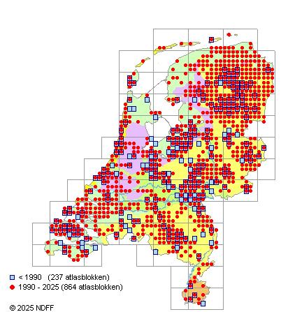 Het aantal atlasblokken (5x5 km) waarin de soort is gemeld binnen een periode van vijf jaar (vanaf 1980) of twintig jaar. Niet gecorrigeerd voor waarnemersinspanning en het aantal doorgegeven waarnemingen kan sterk variëren per periode, dus een trend in verspreiding kan hier niet direct uit worden afgelezen. Het opgegeven jaartal is het eerste jaar van de periode. Bron: gevalideerde waarnemingen uit de NDFF.