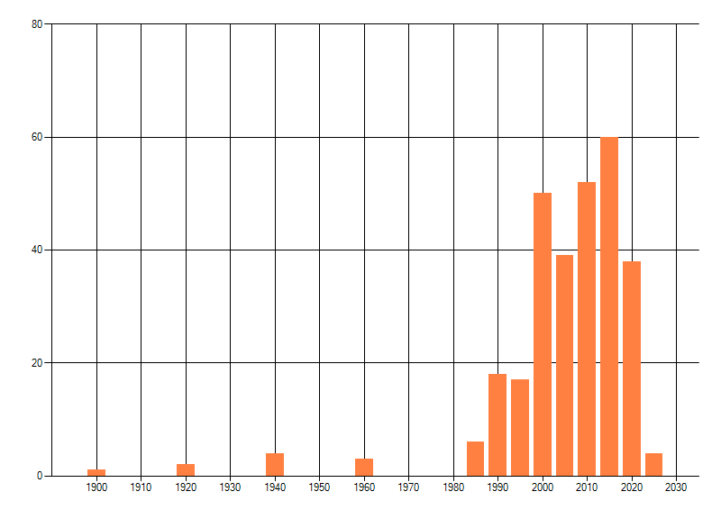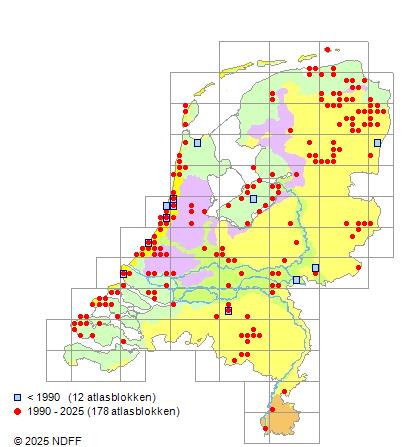 Het aantal atlasblokken (5x5 km) waarin de soort is gemeld binnen een periode van vijf jaar (vanaf 1980) of twintig jaar. Niet gecorrigeerd voor waarnemersinspanning en het aantal doorgegeven waarnemingen kan sterk variëren per periode, dus een trend in verspreiding kan hier niet direct uit worden afgelezen. Het opgegeven jaartal is het eerste jaar van de periode. Bron: gevalideerde waarnemingen uit de NDFF.