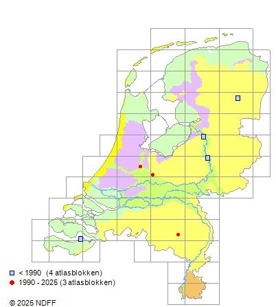 Het aantal atlasblokken (5x5 km) waarin de soort is gemeld binnen een periode van vijf jaar (vanaf 1980) of twintig jaar. Niet gecorrigeerd voor waarnemersinspanning en het aantal doorgegeven waarnemingen kan sterk variëren per periode, dus een trend in verspreiding kan hier niet direct uit worden afgelezen. Het opgegeven jaartal is het eerste jaar van de periode. Bron: gevalideerde waarnemingen uit de NDFF.