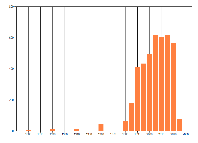 Het aantal atlasblokken (5x5 km) waarin de soort is gemeld binnen een periode van vijf jaar (vanaf 1980) of twintig jaar. Niet gecorrigeerd voor waarnemersinspanning en het aantal doorgegeven waarnemingen kan sterk variëren per periode, dus een trend in verspreiding kan hier niet direct uit worden afgelezen. Het opgegeven jaartal is het eerste jaar van de periode. Bron: gevalideerde waarnemingen uit de NDFF.