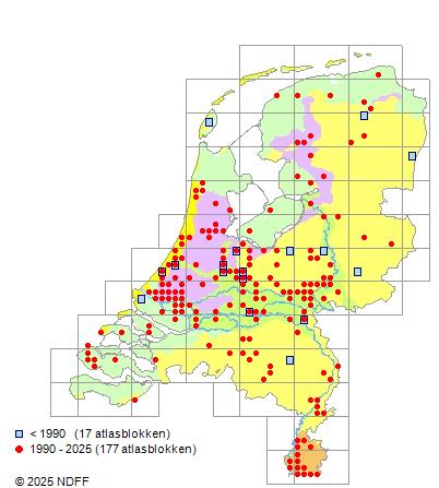 Het aantal atlasblokken (5x5 km) waarin de soort is gemeld binnen een periode van vijf jaar (vanaf 1980) of twintig jaar. Niet gecorrigeerd voor waarnemersinspanning en het aantal doorgegeven waarnemingen kan sterk variëren per periode, dus een trend in verspreiding kan hier niet direct uit worden afgelezen. Het opgegeven jaartal is het eerste jaar van de periode. Bron: gevalideerde waarnemingen uit de NDFF.
