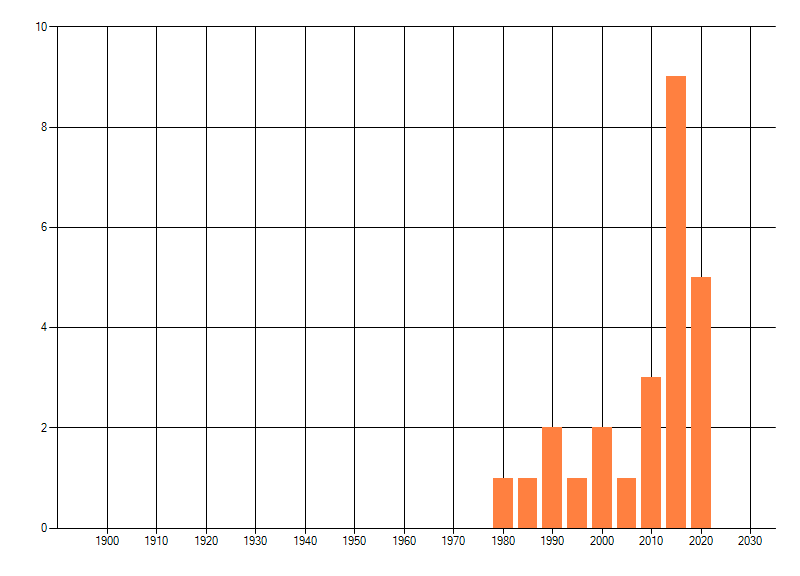Het aantal atlasblokken (5x5 km) waarin de soort is gemeld binnen een periode van vijf jaar (vanaf 1980) of twintig jaar. Niet gecorrigeerd voor waarnemersinspanning en het aantal doorgegeven waarnemingen kan sterk variëren per periode, dus een trend in verspreiding kan hier niet direct uit worden afgelezen. Het opgegeven jaartal is het eerste jaar van de periode. Bron: gevalideerde waarnemingen uit de NDFF.