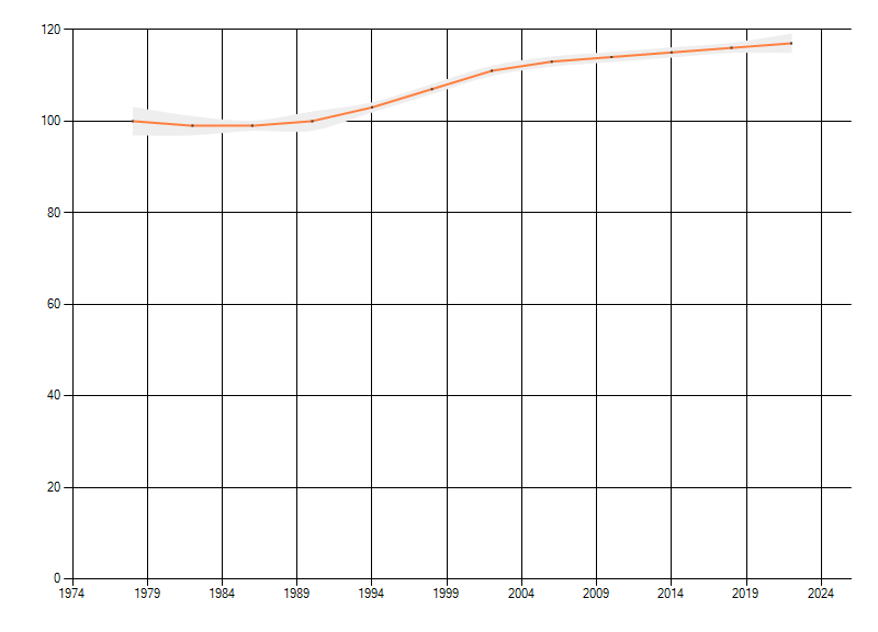 Gemiddelde trend van het aantal kilometerhokken waarin de soort voorkomt, weergegeven als indexcijfer (1975-1978 = 100).