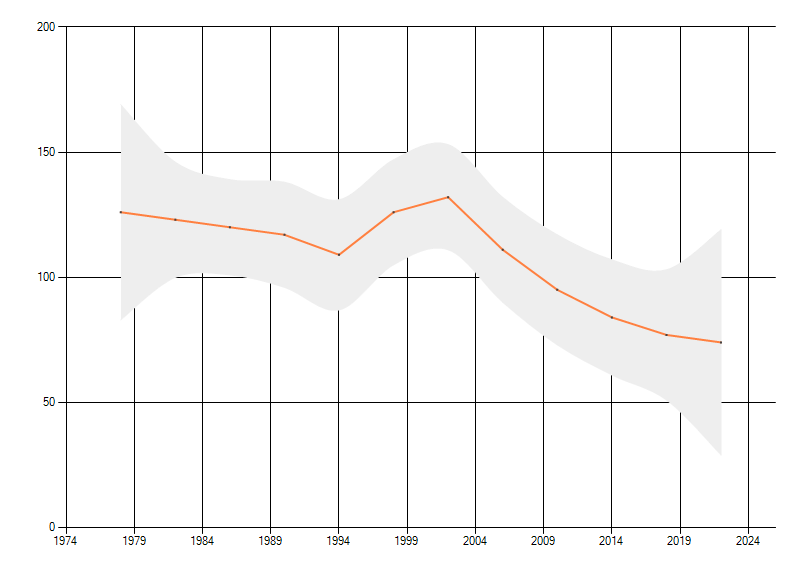 Gemiddelde trend van het aantal kilometerhokken waarin de soort voorkomt, weergegeven als indexcijfer (1975-1978 = 100). De trend is gecorrigeerd voor waarnemersinspanning en geeft de relatieve verandering in het aantal bezette kilometerhokken weer. Voor de berekening worden de data per periode van vier jaar samengenomen. In de grafiek correspondeert ieder punt met het laatste jaar van zo'n periode.