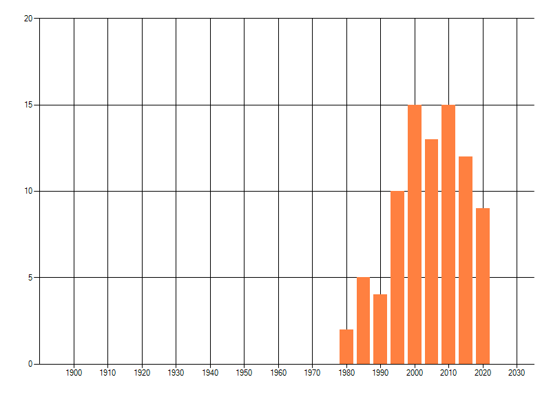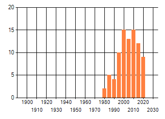 Het aantal atlasblokken (5x5 km) waarin de soort is gemeld binnen een periode van vijf jaar (vanaf 1980) of twintig jaar. Niet gecorrigeerd voor waarnemersinspanning en het aantal doorgegeven waarnemingen kan sterk variëren per periode, dus een trend in verspreiding kan hier niet direct uit worden afgelezen. Het opgegeven jaartal is het eerste jaar van de periode. Bron: gevalideerde waarnemingen uit de NDFF.