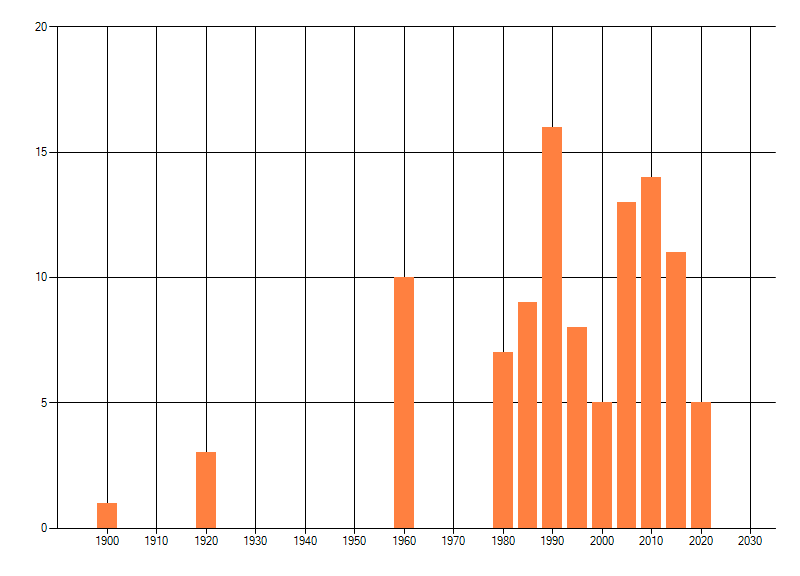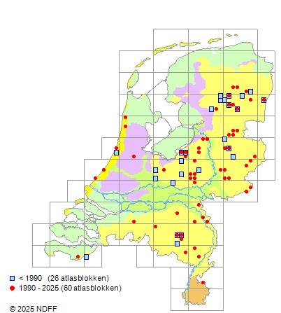 Het aantal atlasblokken (5x5 km) waarin de soort is gemeld binnen een periode van vijf jaar (vanaf 1980) of twintig jaar. Niet gecorrigeerd voor waarnemersinspanning en het aantal doorgegeven waarnemingen kan sterk variëren per periode, dus een trend in verspreiding kan hier niet direct uit worden afgelezen. Het opgegeven jaartal is het eerste jaar van de periode. Bron: gevalideerde waarnemingen uit de NDFF.
