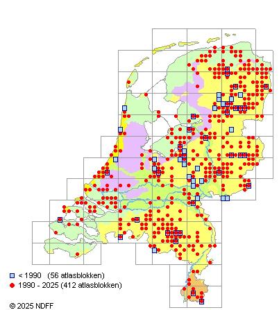 Het aantal atlasblokken (5x5 km) waarin de soort is gemeld binnen een periode van vijf jaar (vanaf 1980) of twintig jaar. Niet gecorrigeerd voor waarnemersinspanning en het aantal doorgegeven waarnemingen kan sterk variëren per periode, dus een trend in verspreiding kan hier niet direct uit worden afgelezen. Het opgegeven jaartal is het eerste jaar van de periode. Bron: gevalideerde waarnemingen uit de NDFF.