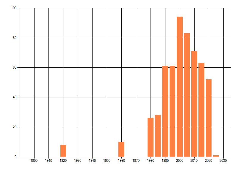 Het aantal atlasblokken (5x5 km) waarin de soort is gemeld binnen een periode van vijf jaar (vanaf 1980) of twintig jaar. Niet gecorrigeerd voor waarnemersinspanning en het aantal doorgegeven waarnemingen kan sterk variëren per periode, dus een trend in verspreiding kan hier niet direct uit worden afgelezen. Het opgegeven jaartal is het eerste jaar van de periode. Bron: gevalideerde waarnemingen uit de NDFF.