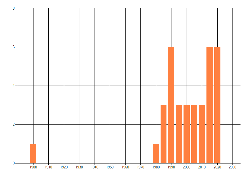 Het aantal atlasblokken (5x5 km) waarin de soort is gemeld binnen een periode van vijf jaar (vanaf 1980) of twintig jaar. Niet gecorrigeerd voor waarnemersinspanning en het aantal doorgegeven waarnemingen kan sterk variëren per periode, dus een trend in verspreiding kan hier niet direct uit worden afgelezen. Het opgegeven jaartal is het eerste jaar van de periode. Bron: gevalideerde waarnemingen uit de NDFF.