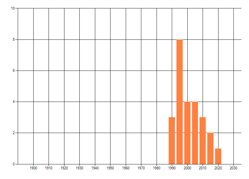 Het aantal atlasblokken (5x5 km) waarin de soort is gemeld binnen een periode van vijf jaar (vanaf 1980) of twintig jaar. Niet gecorrigeerd voor waarnemersinspanning en het aantal doorgegeven waarnemingen kan sterk variëren per periode, dus een trend in verspreiding kan hier niet direct uit worden afgelezen. Het opgegeven jaartal is het eerste jaar van de periode. Bron: gevalideerde waarnemingen uit de NDFF.