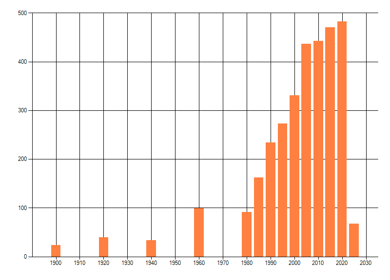 Het aantal atlasblokken (5x5 km) waarin de soort is gemeld binnen een periode van vijf jaar (vanaf 1980) of twintig jaar. Niet gecorrigeerd voor waarnemersinspanning en het aantal doorgegeven waarnemingen kan sterk variëren per periode, dus een trend in verspreiding kan hier niet direct uit worden afgelezen. Het opgegeven jaartal is het eerste jaar van de periode. Bron: gevalideerde waarnemingen uit de NDFF.