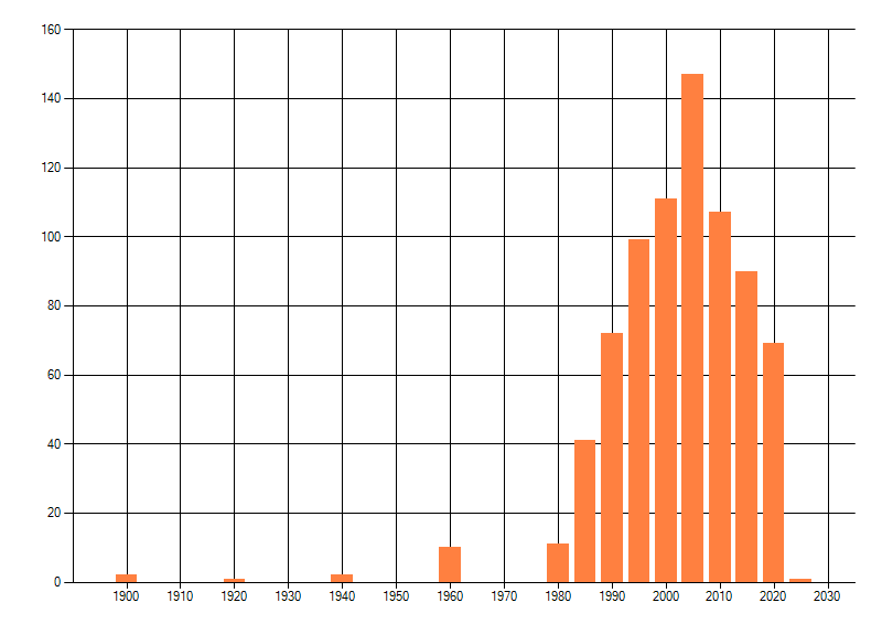 Het aantal atlasblokken (5x5 km) waarin de soort is gemeld binnen een periode van vijf jaar (vanaf 1980) of twintig jaar. Niet gecorrigeerd voor waarnemersinspanning en het aantal doorgegeven waarnemingen kan sterk variëren per periode, dus een trend in verspreiding kan hier niet direct uit worden afgelezen. Het opgegeven jaartal is het eerste jaar van de periode. Bron: gevalideerde waarnemingen uit de NDFF.