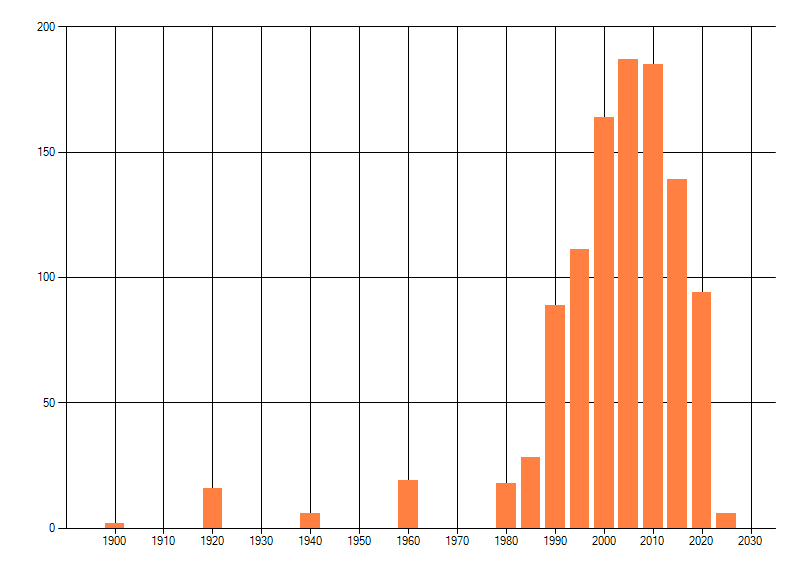 Het aantal atlasblokken (5x5 km) waarin de soort is gemeld binnen een periode van vijf jaar (vanaf 1980) of twintig jaar. Niet gecorrigeerd voor waarnemersinspanning en het aantal doorgegeven waarnemingen kan sterk variëren per periode, dus een trend in verspreiding kan hier niet direct uit worden afgelezen. Het opgegeven jaartal is het eerste jaar van de periode. Bron: gevalideerde waarnemingen uit de NDFF.