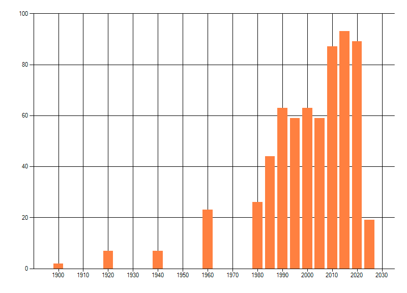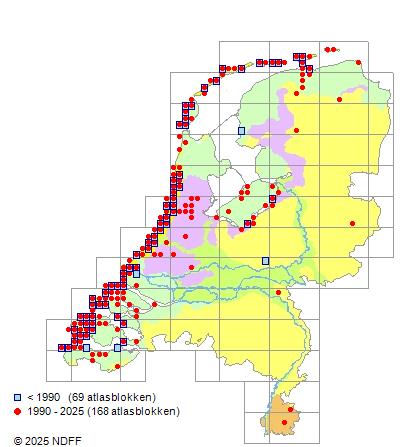 Het aantal atlasblokken (5x5 km) waarin de soort is gemeld binnen een periode van vijf jaar (vanaf 1980) of twintig jaar. Niet gecorrigeerd voor waarnemersinspanning en het aantal doorgegeven waarnemingen kan sterk variëren per periode, dus een trend in verspreiding kan hier niet direct uit worden afgelezen. Het opgegeven jaartal is het eerste jaar van de periode. Bron: gevalideerde waarnemingen uit de NDFF.