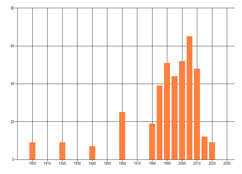 Het aantal atlasblokken (5x5 km) waarin de soort is gemeld binnen een periode van vijf jaar (vanaf 1980) of twintig jaar. Niet gecorrigeerd voor waarnemersinspanning en het aantal doorgegeven waarnemingen kan sterk variëren per periode, dus een trend in verspreiding kan hier niet direct uit worden afgelezen. Het opgegeven jaartal is het eerste jaar van de periode. Bron: gevalideerde waarnemingen uit de NDFF.