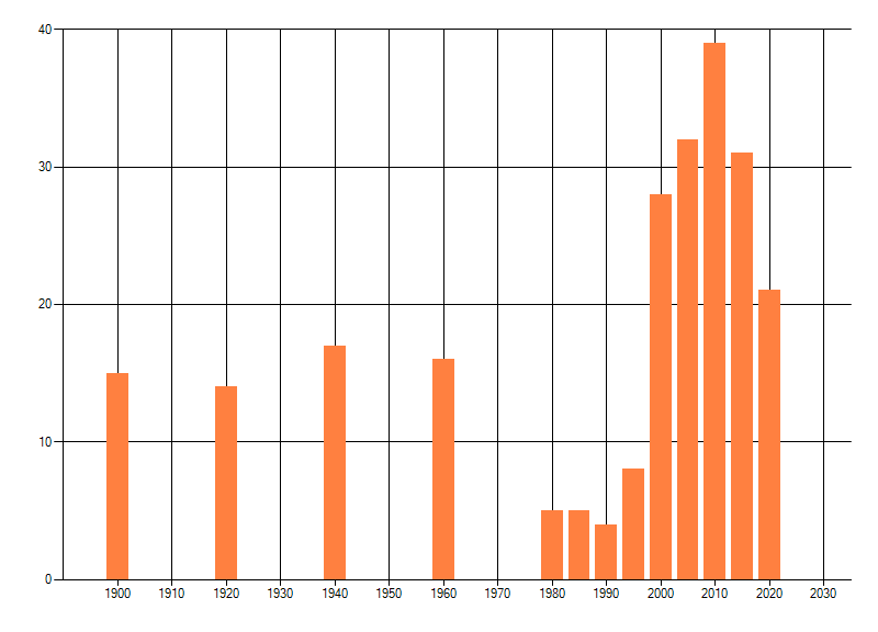 Het aantal atlasblokken (5x5 km) waarin de soort is gemeld binnen een periode van vijf jaar (vanaf 1980) of twintig jaar. Niet gecorrigeerd voor waarnemersinspanning en het aantal doorgegeven waarnemingen kan sterk variëren per periode, dus een trend in verspreiding kan hier niet direct uit worden afgelezen. Het opgegeven jaartal is het eerste jaar van de periode. Bron: gevalideerde waarnemingen uit de NDFF.