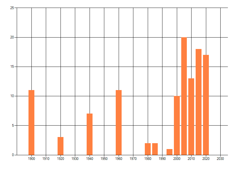 Het aantal atlasblokken (5x5 km) waarin de soort is gemeld binnen een periode van vijf jaar (vanaf 1980) of twintig jaar. Niet gecorrigeerd voor waarnemersinspanning en het aantal doorgegeven waarnemingen kan sterk variëren per periode, dus een trend in verspreiding kan hier niet direct uit worden afgelezen. Het opgegeven jaartal is het eerste jaar van de periode. Bron: gevalideerde waarnemingen uit de NDFF.
