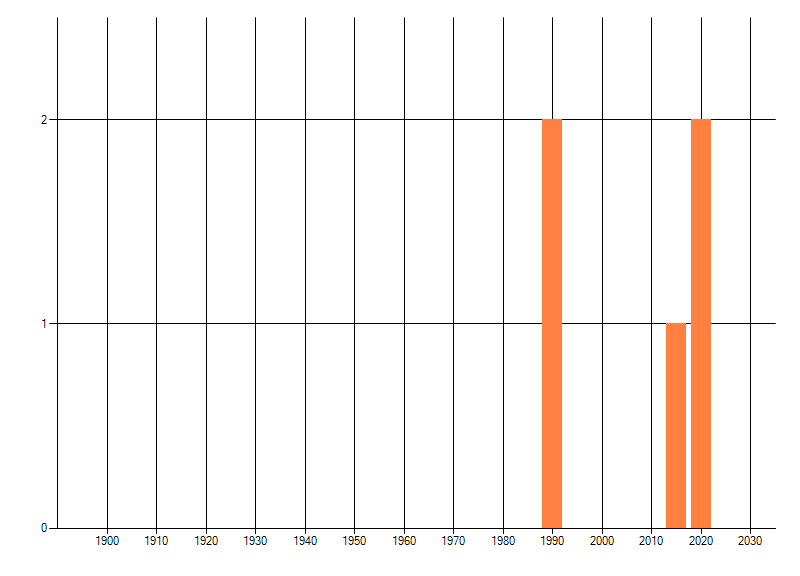 Het aantal atlasblokken (5x5 km) waarin de soort is gemeld binnen een periode van vijf jaar (vanaf 1980) of twintig jaar. Niet gecorrigeerd voor waarnemersinspanning en het aantal doorgegeven waarnemingen kan sterk variëren per periode, dus een trend in verspreiding kan hier niet direct uit worden afgelezen. Het opgegeven jaartal is het eerste jaar van de periode. Bron: gevalideerde waarnemingen uit de NDFF.