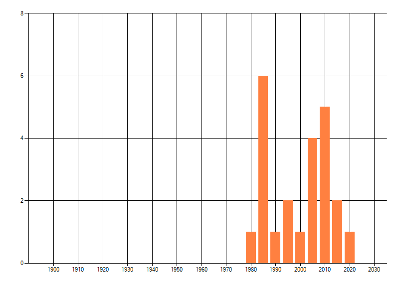 Het aantal atlasblokken (5x5 km) waarin de soort is gemeld binnen een periode van vijf jaar (vanaf 1980) of twintig jaar. Niet gecorrigeerd voor waarnemersinspanning en het aantal doorgegeven waarnemingen kan sterk variëren per periode, dus een trend in verspreiding kan hier niet direct uit worden afgelezen. Het opgegeven jaartal is het eerste jaar van de periode. Bron: gevalideerde waarnemingen uit de NDFF.