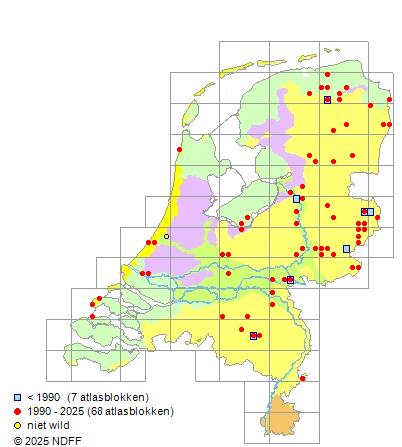 Het aantal atlasblokken (5x5 km) waarin de soort is gemeld binnen een periode van vijf jaar (vanaf 1980) of twintig jaar. Niet gecorrigeerd voor waarnemersinspanning en het aantal doorgegeven waarnemingen kan sterk variëren per periode, dus een trend in verspreiding kan hier niet direct uit worden afgelezen. Het opgegeven jaartal is het eerste jaar van de periode. Bron: gevalideerde waarnemingen uit de NDFF.