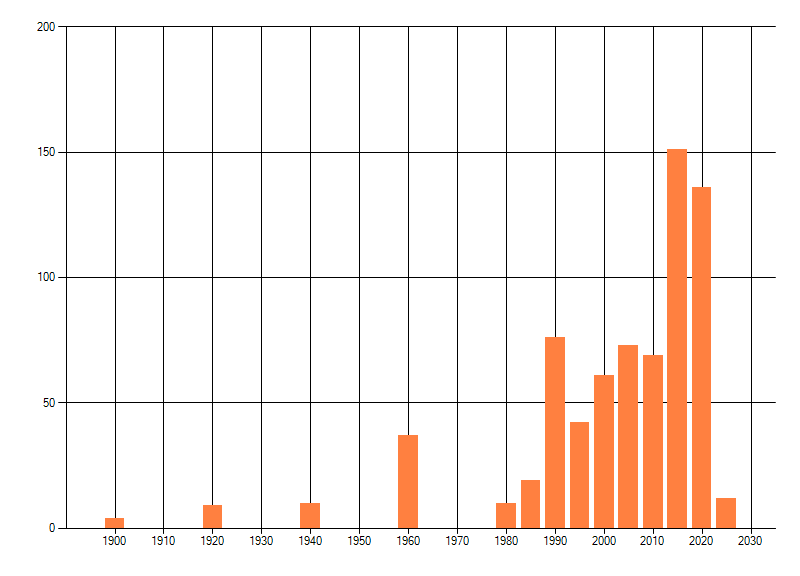 Het aantal atlasblokken (5x5 km) waarin de soort is gemeld binnen een periode van vijf jaar (vanaf 1980) of twintig jaar. Niet gecorrigeerd voor waarnemersinspanning en het aantal doorgegeven waarnemingen kan sterk variëren per periode, dus een trend in verspreiding kan hier niet direct uit worden afgelezen. Het opgegeven jaartal is het eerste jaar van de periode. Bron: gevalideerde waarnemingen uit de NDFF.