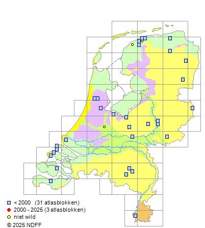 Het aantal atlasblokken (5x5 km) waarin de soort is gemeld binnen een periode van vijf jaar (vanaf 1980) of twintig jaar. Niet gecorrigeerd voor waarnemersinspanning en het aantal doorgegeven waarnemingen kan sterk variëren per periode, dus een trend in verspreiding kan hier niet direct uit worden afgelezen. Het opgegeven jaartal is het eerste jaar van de periode. Bron: gevalideerde waarnemingen uit de NDFF.