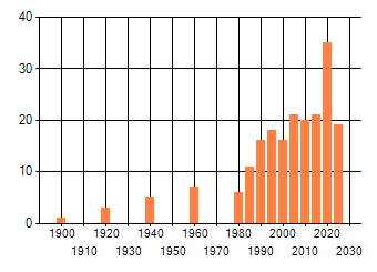 Het aantal atlasblokken (5x5 km) waarin de soort is gemeld binnen een periode van vijf jaar (vanaf 1980) of twintig jaar. Niet gecorrigeerd voor waarnemersinspanning en het aantal doorgegeven waarnemingen kan sterk variëren per periode, dus een trend in verspreiding kan hier niet direct uit worden afgelezen. Het opgegeven jaartal is het eerste jaar van de periode. Bron: gevalideerde waarnemingen uit de NDFF.